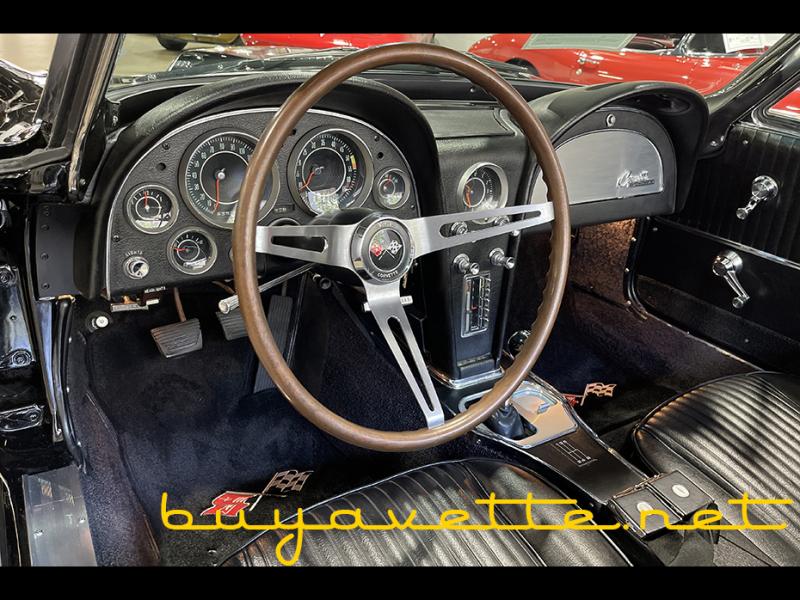 Features include 4 wheel disc brakes, power steering. Originally assembled on April 11, 1964, this 1964 Corvette Restomod Convertible is in extremely nice condition inside and out, and has been refinished in the popular Black/Black color combination with an added '67 stinger style hood and Red vinyl stripe. This car's odometer currently shows 63,554 miles; however, we are unable to document actual miles on this car, so it will be sold as "MILEAGE EXEMPT". This car's paint is vg, looking to be a recent show quality job, with an absolutely stunning shine. Convertible top is vg, front chrome bumpers show a vg finish, and rear chrome bumpers show a good-vg finish. Taillights, weatherstripping, and exterior door handles are all vg-exc as well, in addition to the added 16 inch American Racing Torq Thrust II wheels, which are finished in Gloss Black with a polished lip. BF Goodrich Sport Comp-2 tires are sized 215/55/16, and show an average of 8/32nds (89%) tread depth remaining. The interior of this 1964 Corvette Restomod Convertible shows vg-exc seats, gauges, dash pods, and center console, exc glovebox lid, good condition door panels, and vg steering wheel. Correct appearing AM/FM radio is in place, and a Hurst shifter and Black shift ball have been added.