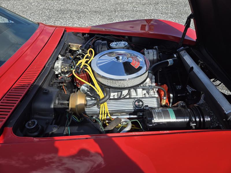 The previous owners made a number of performance and handling upgrades to this Corvette. The front and rear suspension have been upgraded with Vette Brakes suspension components, including Vette Brakes upper and lower control arms. It also features rack-and-pinion power steering, MSD ignition, Hooker Header side pipes, a Holley aluminum intake, and a Holley carburetor. The original engine has been rebuilt, and the car was refinished in a base coat/clear coat paint job.