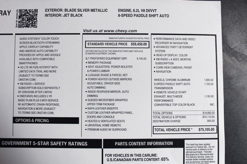 This car has 66K miles and is just in from its senior owner. The original window sticker indicating an MSRP of $75,105, complete owner’s portfolio, and both key FOB’s are included. Meticulously maintained and religiously serviced this Stingray could easily pass for a car with just a fraction of these miles. Nicely detailed and ready for fun in the sun!