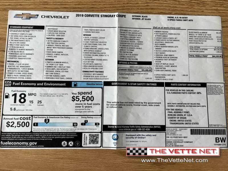 We are proud to feature a privately owned 2019 Stingray Coupe dressed in classy Black on Black. With a little over 40K miles, it was enjoyed by just one female owner since day one and comes equipped with: